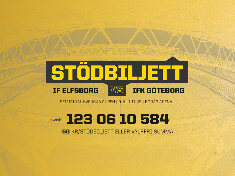 IF Elfsborg är otroligt tacksamma för det stöd alla supportrar visat under den här tuffa perioden när föreningen tvingas till matcher utan publik. Det enklaste sättet att bidra är genom att köpa så kallade stödbiljetter för 50 kr (eller valfri summa). Stödbiljetter är en gåva till föreningen, men bland alla som är med och stöttar i samband med torsdagens semifinal, och de som gissar rätt på vilken matchminut det första målet i matchen görs i har chans att vinna Elfsborgsprylar. För att vara med och tävla, skriv i meddelandefältet i Swishfunktionen, vilken matchminut du tror första målet görs i. Vinnarna presenteras på fredag. Har du köpt fler biljetter, desto större vinstchans.