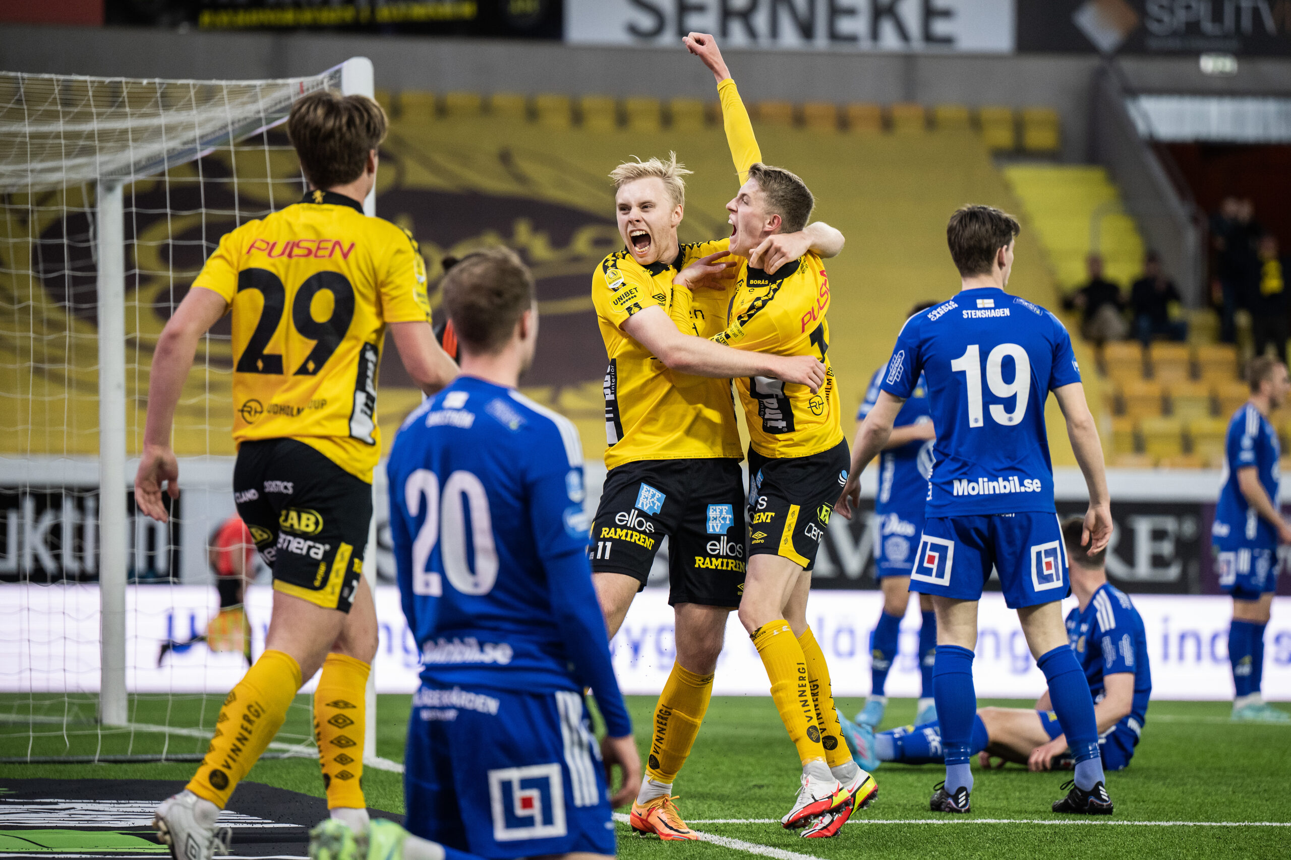 220425 Elfsborgs Sveinn Gudjohnsen och Alexander Bernhardsson jublar efter 2-1 under fotbollsmatchen i Allsvenskan mellan Elfsborg och GIF Sundsvall den 25 april 2022 i Borås. Foto: Jörgen Jarnberger / BILDBYRÅN / COP 112 / JJ0182